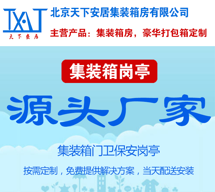 北京集裝箱式房集裝箱門禁通道定制價(jià)格8000元起,公司規(guī)模大,200個(gè)以內(nèi)的箱子(包括床),3天之內(nèi)可按您的要求全部安裝完畢;押金、租金、運(yùn)費(fèi)和銷售價(jià)格不高于任何一個(gè)集裝箱廠家,因?yàn)槲覀冇幸?guī)模的優(yōu)勢;具有完整的集裝箱房屋產(chǎn)品生產(chǎn)鏈體系,齊全的產(chǎn)品種類,能滿足不同層次客戶的需求。天下安居規(guī)模較大、實(shí)力較強(qiáng)、網(wǎng)點(diǎn)較多的特大型住人集裝箱移動(dòng)房生產(chǎn)企業(yè)集團(tuán)。